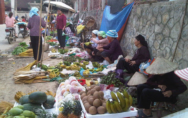 Chợ quê những ngày tháng ấy cũng chẳng có gì to tát, cái tôm, con tét bắt ở dưới đồng lên bán, mớ rau cọng cỏ hái ở dưới ruộng lên bán, … Chỉ vẻn vẹn một chòm và không thể thiếu những hàng quà. Những quả táo vào mùa Xuân, quả nhót, quả ổi vào mùa Hè, quả thị, quả na vào mùa Thu, hay quả mận vào mùa Đông. Hoặc là nắm bỏng mật, cái bánh đa, …